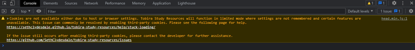 When using Tobira Study Resources offline or embedded on another site, sometimes you may run into an issue where your settings will not save and dark mode is missing. This is usually related to the blocking of third-party cookies, which forces the site to run in limited mode, preventing your settings from being saved and showing the following warning in the web console (F12 or Right Click > Inspect > Console).